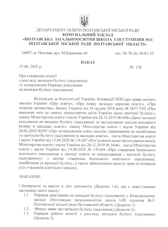 Порядок реагування на випадки булінгу в закладі освіти